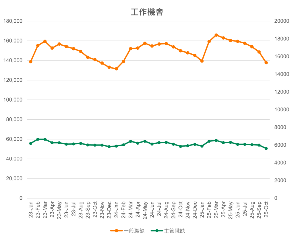 • 市場訊號: 2025 年初高峰的工作機會數突破 16 萬筆,創近三年新高。