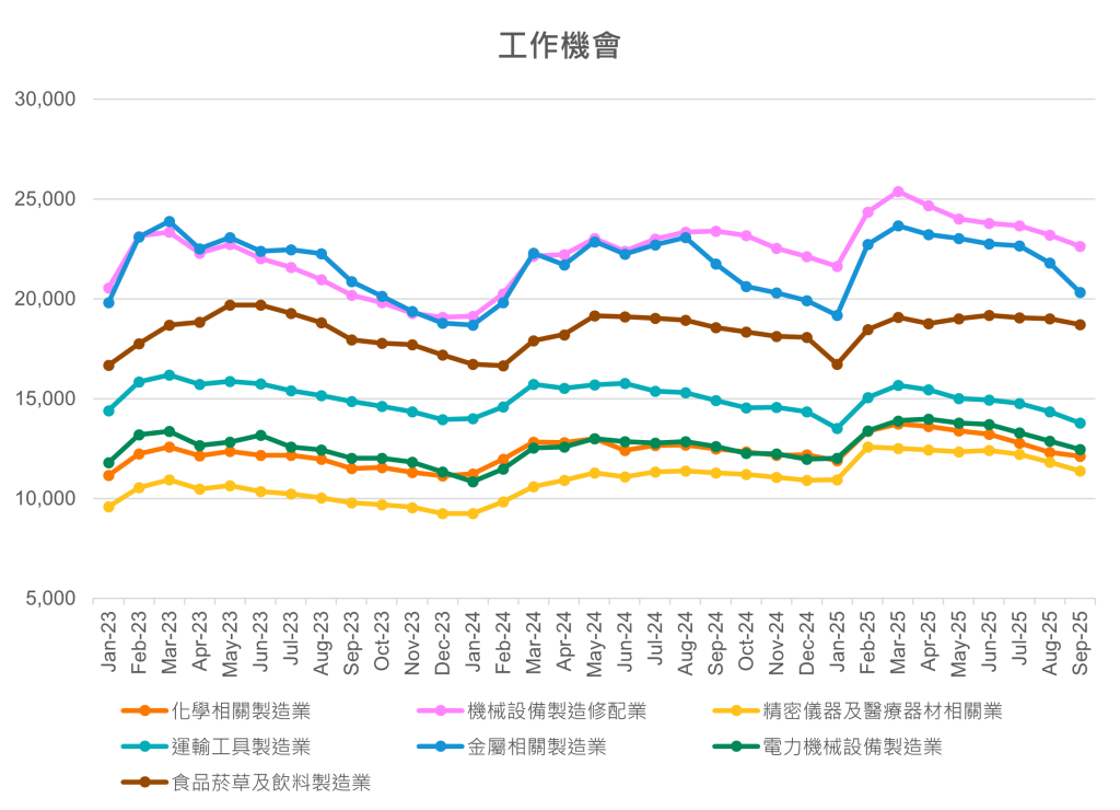 關鍵趨勢: 電力機械設備製造業化學相關製造業、以及精密儀器及醫療器材相關業在 2025 年的工作機會年增 7%。這波增長反映了能源轉型、綠色製造與醫療科技帶動的新興需求