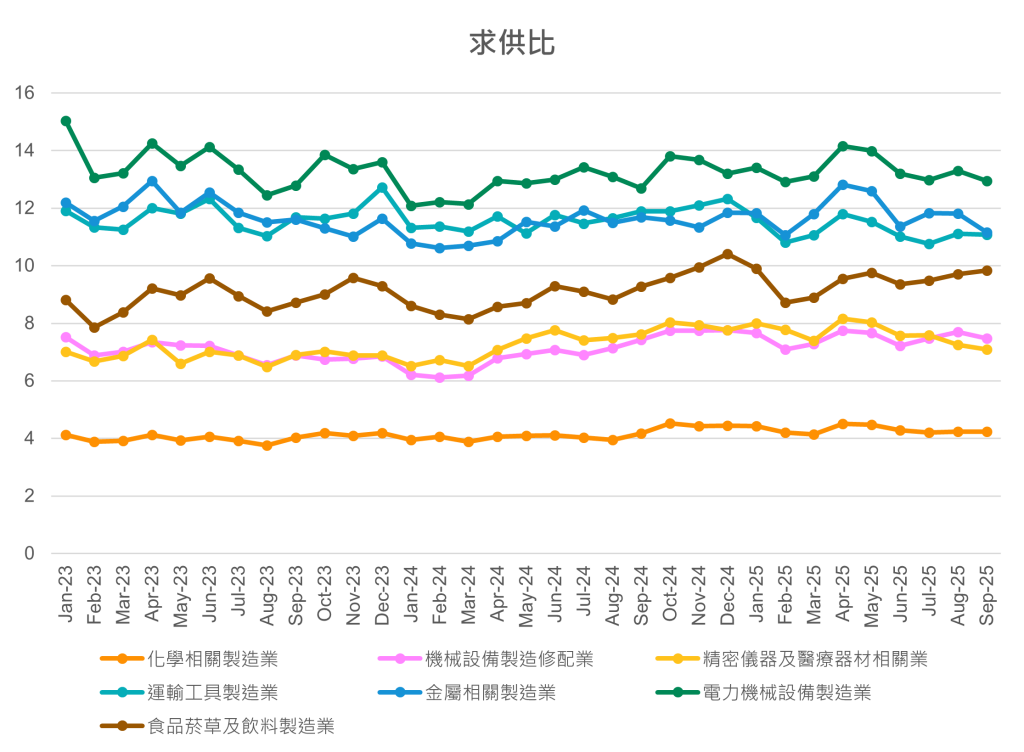 • 缺工最嚴重:電力機械設備製造業的求供比平均維持在 10 以上