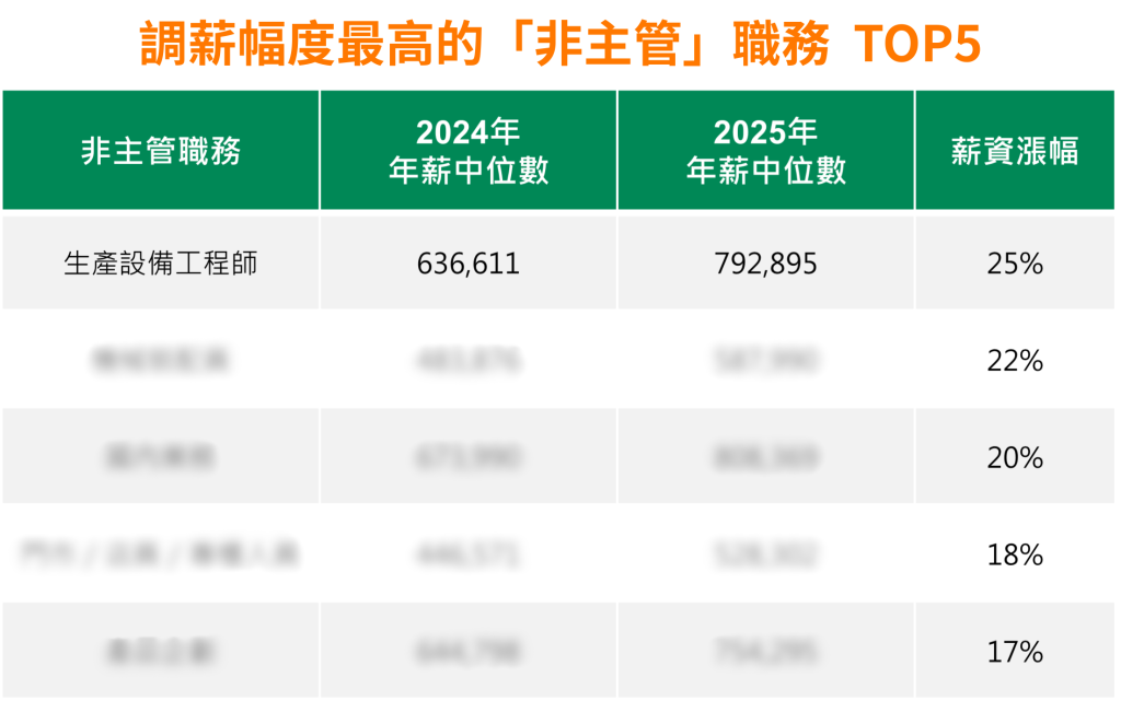 • 技術留才代表:生產設備工程師,年薪中位數成長 25%