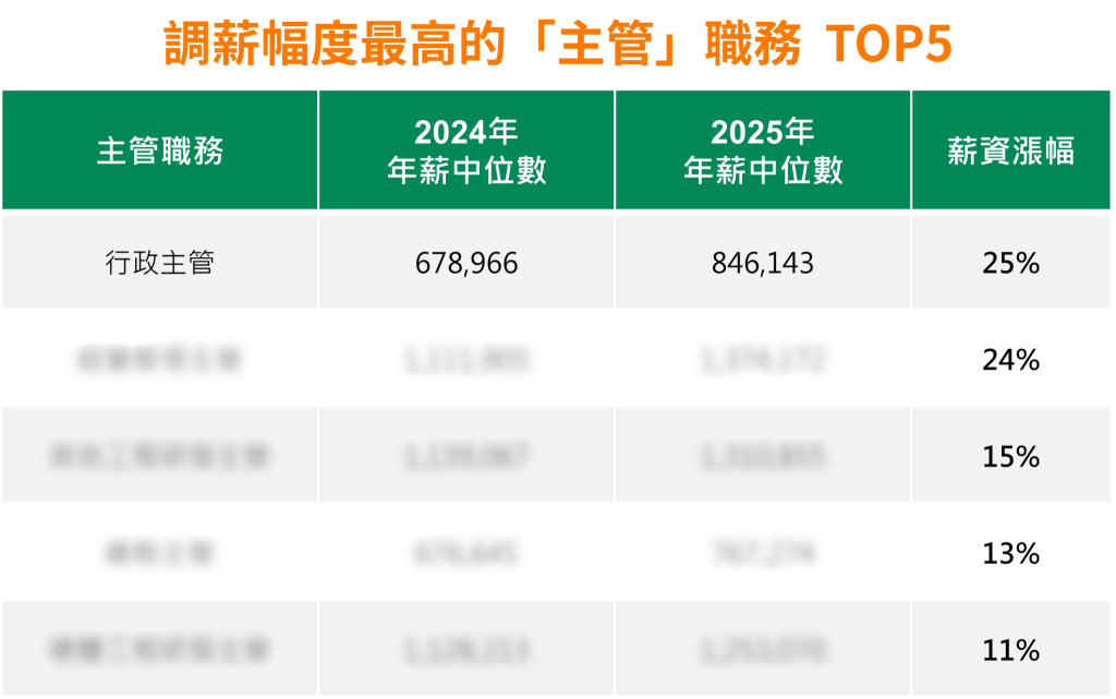 • 效率補漲代表:行政主管,年薪中位數成長 25%