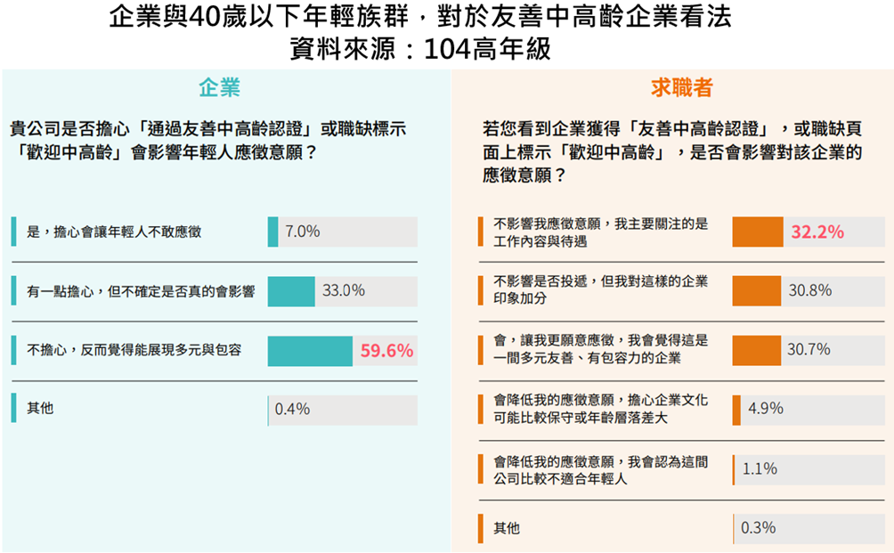 《2025超高齡社會企業人才永續的新思維白皮書》指出,40%企業擔心獲得「友善中高齡認證」,或職缺頁上標示「歡迎中高齡」,可能影響年輕人應徵意願,不過,93.7%的40歲以下年輕人對於友善中高齡企業持正向或中立態度,其中,32.2%聚焦工作內容與待遇,並有30.8%對企業印象加分,30.7%直接提高應徵意願,以實際行動,想進入多元友善、有包容力的企業。