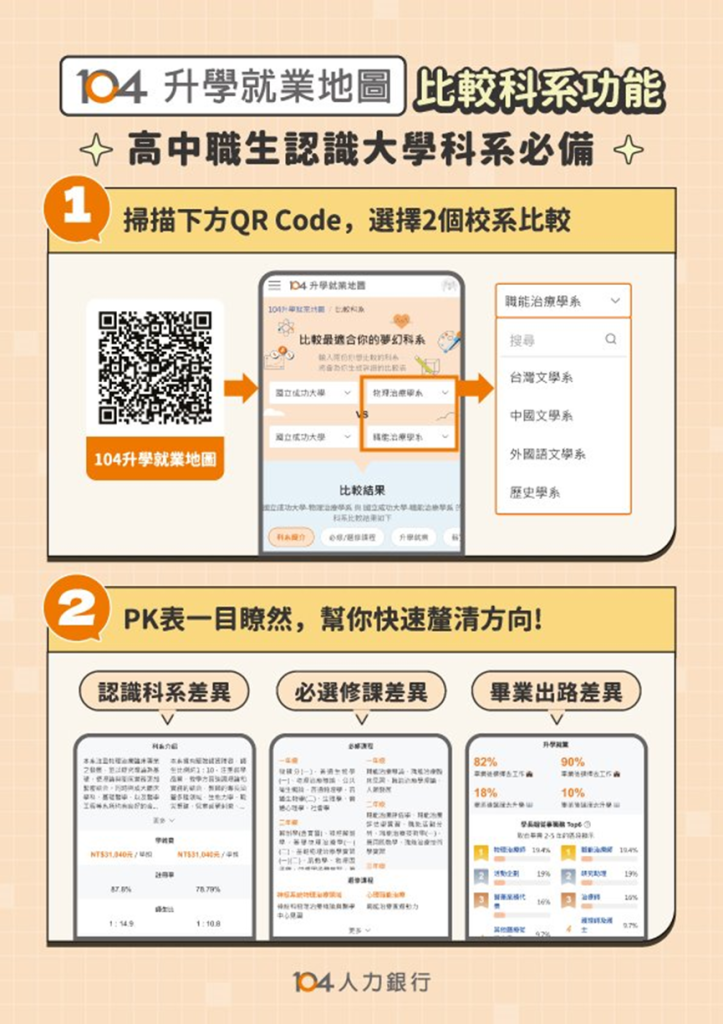 為了協助學生在升學過程中做出更清晰的選擇,104人力銀行也持續提供多項線上工具: