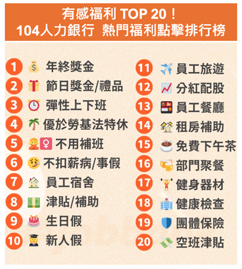 104人力銀行「有感福利」熱門點擊排名 TOP20