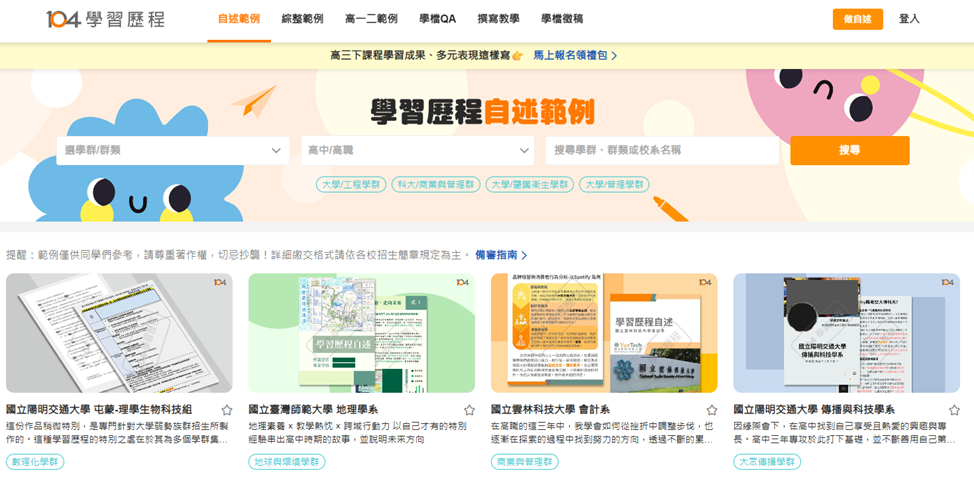 為降低學生撰寫門檻,104學習歷程(https://tw104.pse.is/8vkrah)整理出系統化的參考資源,收錄近2,000份範本,涵蓋不同學群與申請方向,並提供科系篩選、學長姊實際申請經驗,及高中、大學教師的撰寫建議,協助學生掌握內容架構與撰寫重點,建議從真實經驗出發,梳理能力、興趣與價值觀,善用工具釐清內容脈絡,更容易找到適合自己的學習方向,銜接下一階段升學選擇。