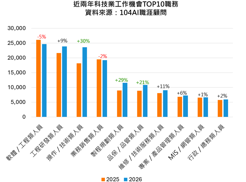 根據《2026年科技業人才報告書》,2026年科技業主要徵才職務軟體/工程類每月徵才2.5萬人最多、工程/研發類與操作/技術類2.4萬人居次。104人力銀行人才永續長鍾文雄指出,隨著AI工具的普及與效率提升,企業對工程師的需求正從「量」的擴張轉向「質」的盤整,軟體/工程類工作機會年減5%;操作/技術類提升30%、製程規劃類成長29%、品保/品管類增21%,反映出科技業發展重心正落地於實體產能的優化與良率的提升。對於具備現場管理與流程規劃能力的在職者來說,工作機會在自動化浪潮中不減反增。