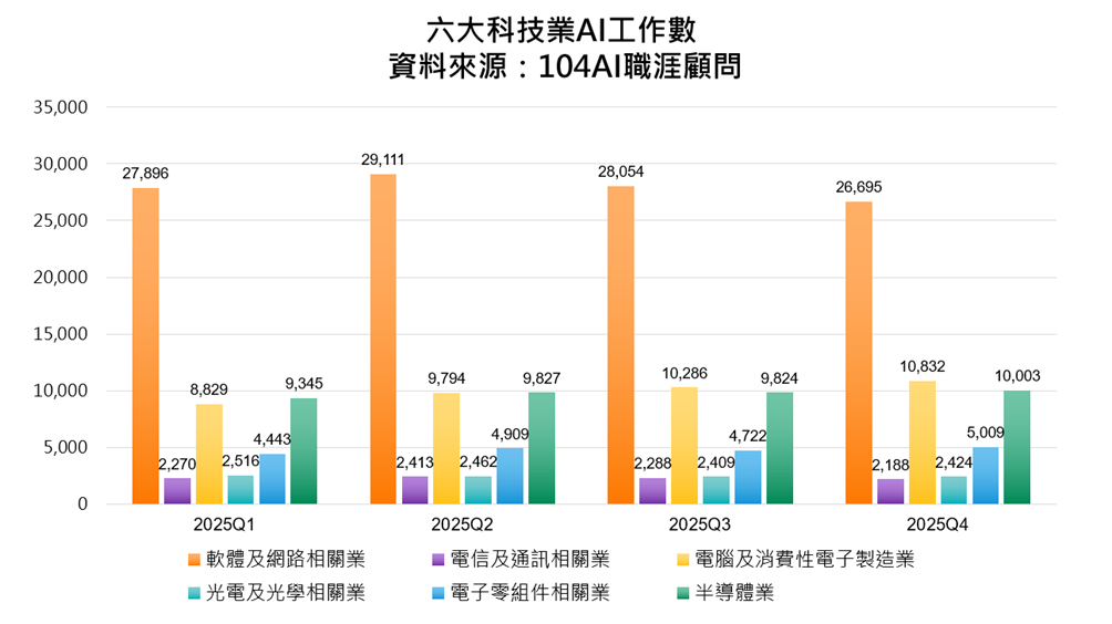 AI從技術研發走向應用,《2026年科技業人才報告書》數據顯示,科技業中以軟體網路業的AI工作機會單季約2.7萬個最多、電腦及消費性電子製造業1.1萬個第二、半導體業1萬個第三。進一步觀察各產業AI工作機會占整體的比例,軟體及網路業自2025年維持在3成以上,顯示產業已進入高成熟度階段,AI 幾乎成為標配技能;電腦及消費性電子製造業變化最為明顯,占比由22%穩定上升至26%,反映AI正快速滲透至產品設計、製造流程與智慧應用;半導體業則維持在21%至22%間,小幅成長但節奏穩定,顯示AI導入多集中於關鍵製程與高價值環節,策略相對審慎;電信通訊、電子零組件與光電光學,AI占比多落在13%至16%,仍屬於逐步擴散的導入期。