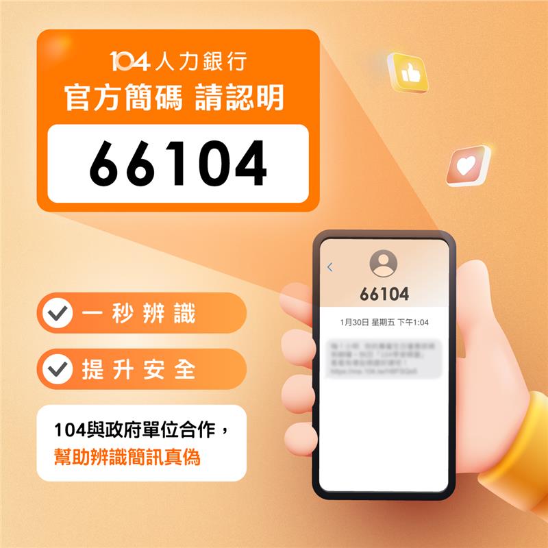 104人力銀行領先同業,即日起,104官方簡訊皆以「66104」固定簡碼寄出!104人力銀行產品暨價值營運處資深協理王之璘指出,官方簡碼「66104」由104人力銀行、三大電信廠商和簡訊業者共同合作,認證發訊方和訊息內容網址,具備唯一性、無法被竄改和冒用;當求職會員收到「66104」的簡訊,可明確知道該則簡訊由104人力銀行發送,簡訊內容值得信賴為官方發布的真實訊息,既能確保求職者資訊安全和知情權,也能防範求職釣魚的詐騙簡訊。