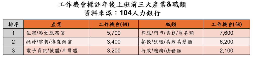 各產業「年後上班」工作占比較高的有:大眾傳播業占3.1%、住宿/餐飲服務業占2.4%、批發/零售/傳直銷占2.1%、法律/會計/顧問/研發/設計業占2.1%;工作機會數則以住宿/餐飲服務業5,700個最多,其次為批發/零售/傳直銷業3,400個、電子資訊/軟體/半導體3,200個。越缺工的產業,越想在年前先搶人,越願意提供求職者年後報到的時間彈性。