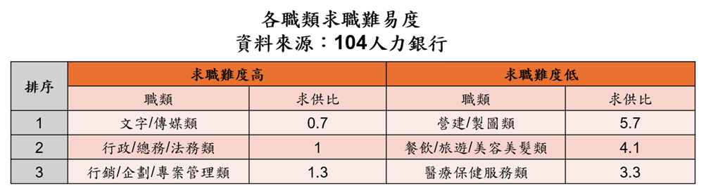 哪些工作較好找?哪些難找?104人力銀行觀察求職求才供需關係,文字傳媒類工作者平均僅能分到0.7份工作,行政/總務/法務類1份、行銷/企劃/專案管理類1.3份最競爭;營建/製圖類5.7份、餐飲/旅遊/美容美髮類4.1份、醫療保健服務類3.3份,找工作相對容易。