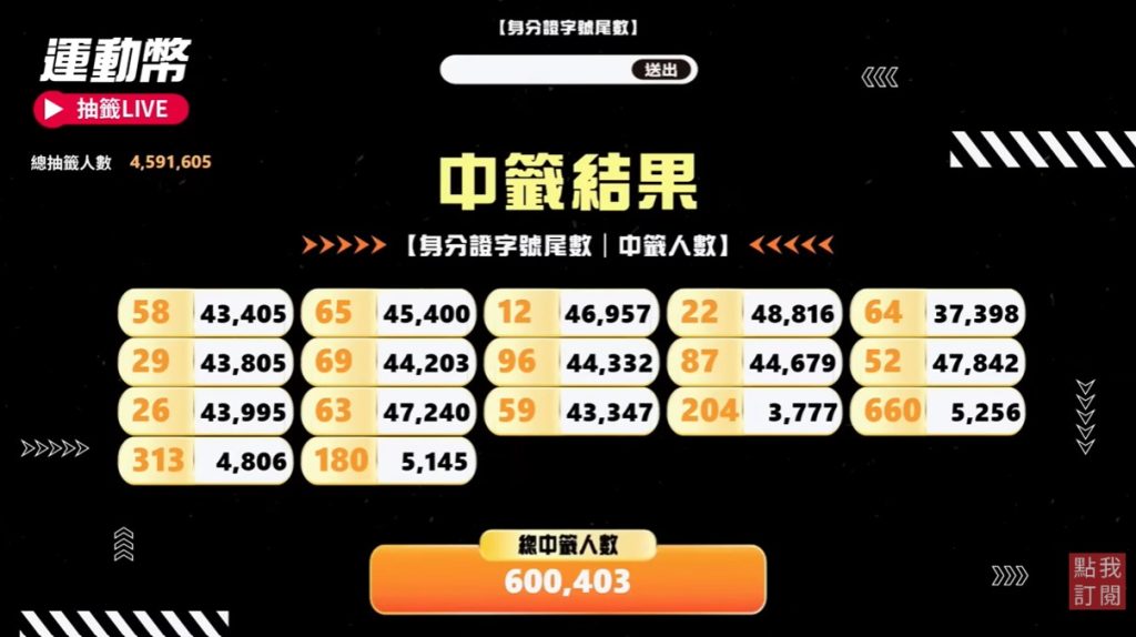 運動幣中獎號碼已於2月12日下午直播抽出,分別有身分證字號尾數末兩碼和末三碼兩大組別,各組號碼如下: