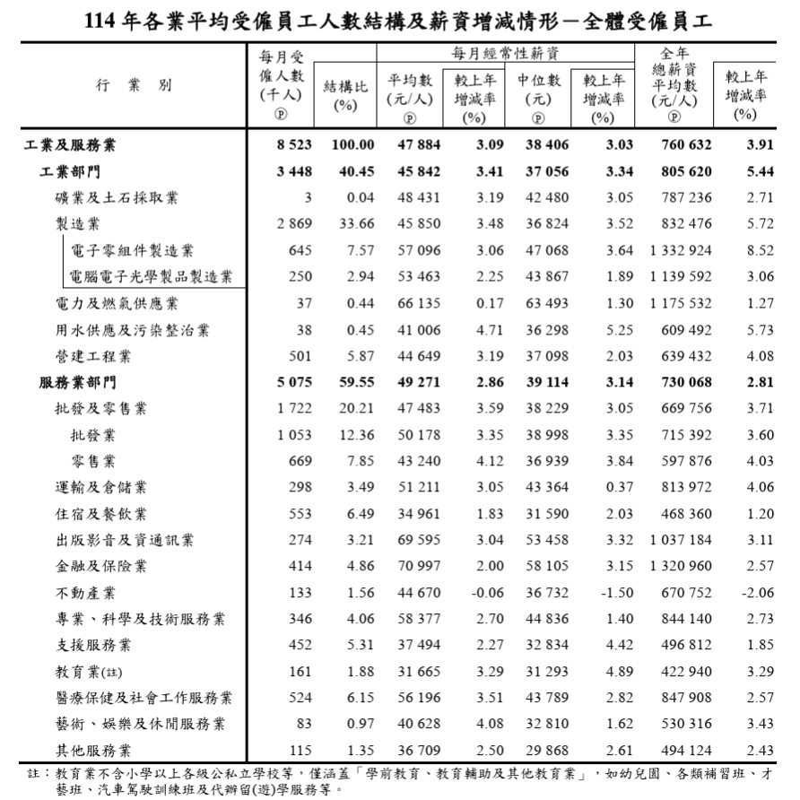行政院主計總處指出,觀察114年行業別經常性薪資平均數變動情形,各行業多較上年成長,其中批發及零售業年增3.59%、醫療保健及社會工作服務業年增3.51%、製造業亦年增3.48%。全年總薪資平均數部分,製造業因年節獎金及績效獎金發放較多,年增5.72%,其中電子零組件製造業增加8.52%;運輸及倉儲業亦增4.06%。