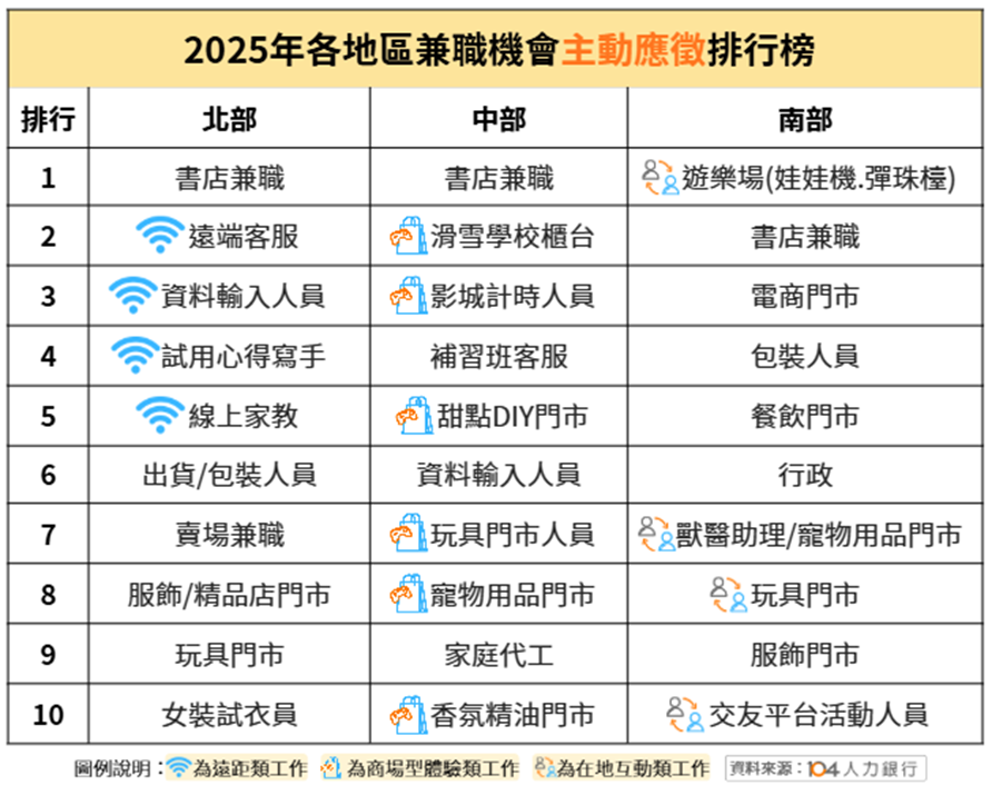 104人力銀行價值營運部資深經理翁瑀婷指出,在生活節奏快、通勤成本高的北部,求職者選擇兼職工作更在意「時間是否能有效切割運用」,除了長居榜上的書店兼職外,遠端客服、資料輸入、試用心得寫手與線上家教等可遠距執行的工作,佔據北部人主動應徵的前段班,兼職是否能嵌入既有的正職空檔或有效運用零散時間,已成為北部兼差族選擇的重要參考。