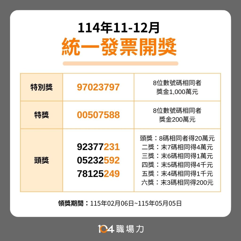 最新114年11-12月統一發票千萬元特別獎號為「97023797」,200萬元特獎號碼為「00507588」,20萬頭獎3組分別為「41016094」、「98081574」、「07309261」。領獎期間為114年12月06日起至115年03月05日。詳細獎項如下,《104職場力》祝大家幸運中獎!