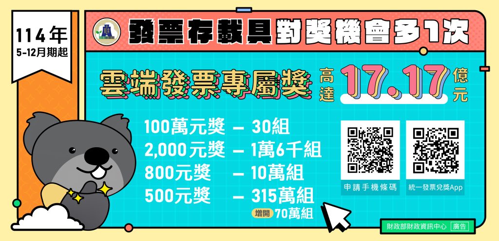 更多雲端發票專屬獎及注意事項請至財政部網站查詢: