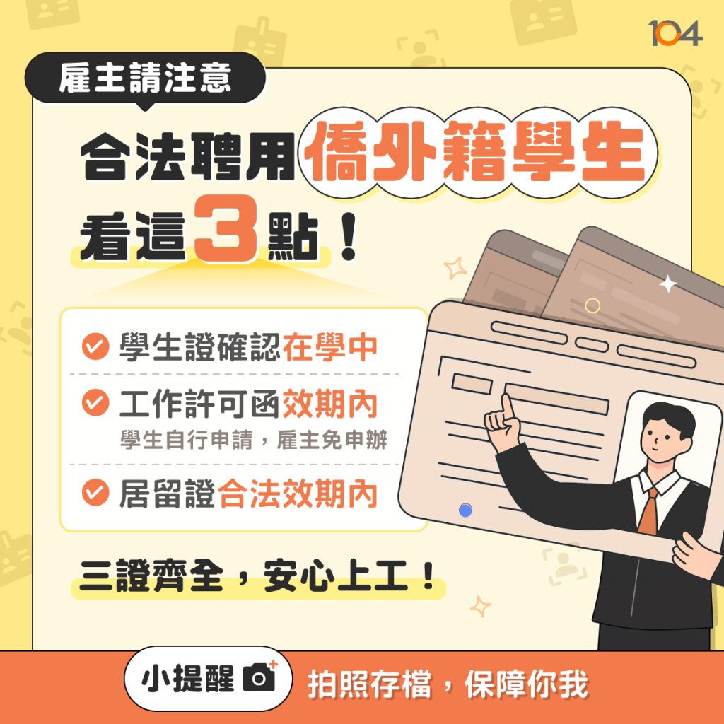 提醒您,僑外生須持有效工作許可才能合法任職。建議在聘用前務必向應徵的僑外生確認以下兩點: