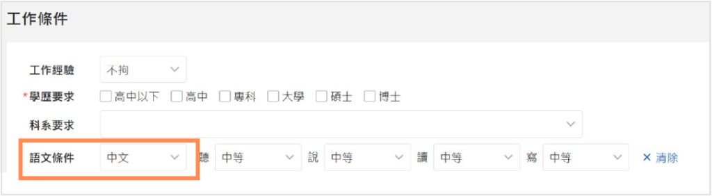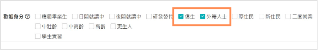 刊登職缺時,記得勾選「僑生」或「外籍」身份,讓有興趣的僑外生更容易找到你的職缺。如果擔心語言溝通問題,也可以在職缺內容加上「需具備中文聽說能力」,或在「語文條件」欄位中勾選對中文的需求,幫助媒合更精準、更順利。