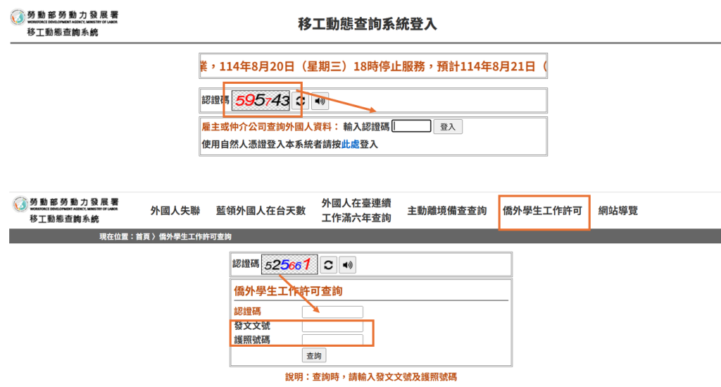 4.輸入頁面上的認證碼,及僑外學生的工作許可函發文文號護照號碼,即可完成查詢