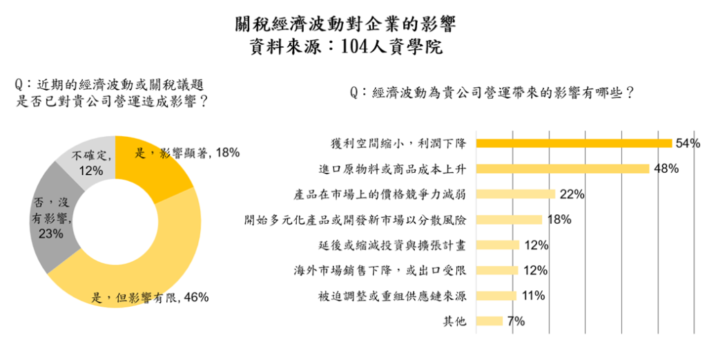 至於關稅經濟變動,對於所有企業會產生哪些衝擊?104人資學院於2025/6/7~7/3針對全台灣812位企業的管理者、用人主管與人資透過網路問卷,完成「關稅與經濟變動影響人資管理調查」,65%受訪企業認為關稅與經濟波動已對公司營運造成影響;這些影響依序為:54%認為獲利空間縮小,利潤下降、48%進口原物料或商品成本上升、22%產品在市場上的價格競爭力減弱。
