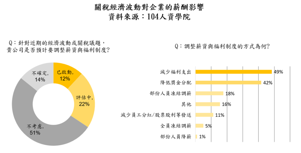 至於關稅經濟波動對企業薪酬的影響,104人資學院調查顯示,12%企業已啟動調整薪資與福利制度,22%評估中,合計有34%企業已啟動或評估調整薪資與福利制度。調整方式,49%減少福利支出最多、42%降低獎金分配第二、18%部分人員凍結調薪第三。104人資學院表示,缺工時代維持薪酬競爭力是企業留才、攬才的重要關鍵,當進行薪酬福利調整時,必須掌握市場行情,避免優秀人才流失,104薪酬平台「每週」動態更新市場薪資情報,可比對各縣市與78個產業、幫助企業即時計算薪資競爭力。