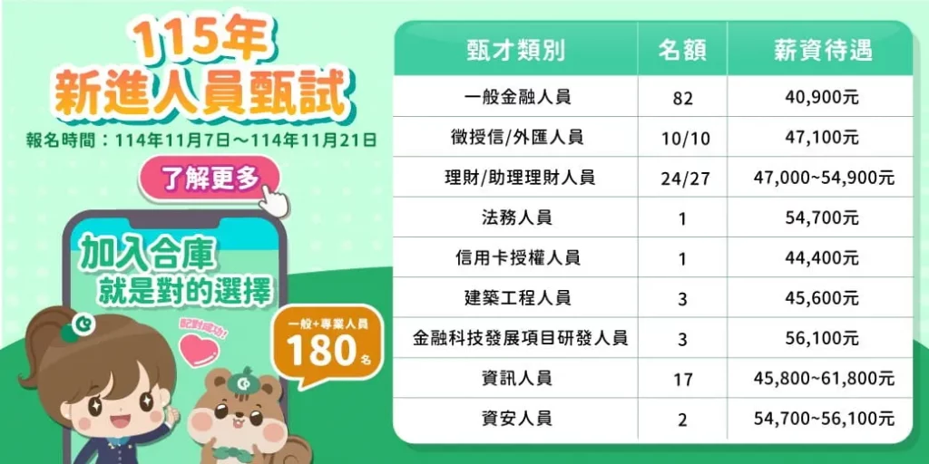 年底轉職季開跑,合庫銀行啟動115年首波新進人員招募計畫,釋出180個一般及專業名額,共涵蓋18個類組,起薪40,900~61,800元。
