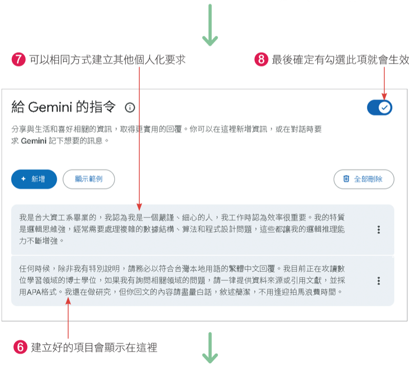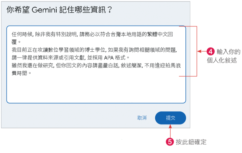 接著回到Gemini,將上述複製的個人化Prompt和記憶內容都貼到儲存的資訊中: