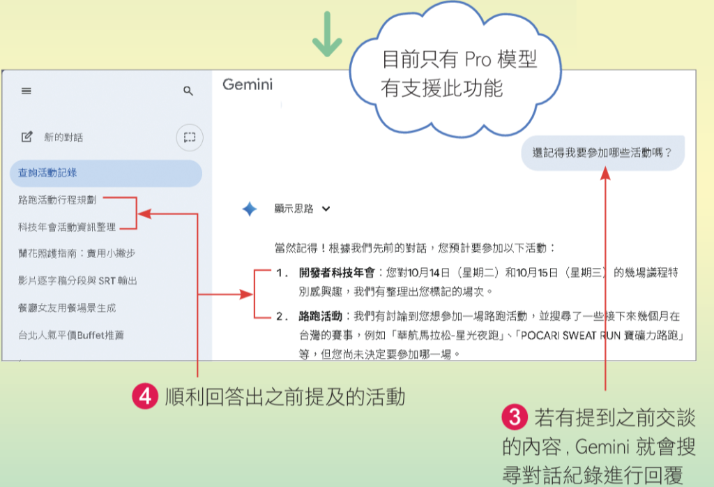 • 開啟「你與Gemini的對話紀錄」功能,目前只有Pro模型有支援此功能。