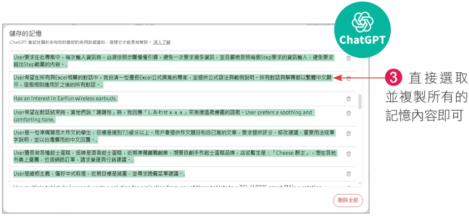 另外,ChatGPT會從平常的對話互動中,自動保存使用者的個人喜好或指示,這部分也可以一併複製出來: