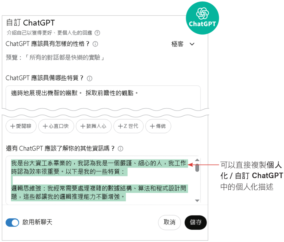 除了Gemini以外,目前主要的AI平台,通常都有提供個人化設定的功能,若先前已經設定過,可以將個人化的Prompt直接複製到Gemini使用。此處以最多人使用的ChatGPT來示範:
