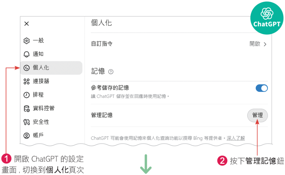 • 開啟ChatGPT的設定畫面,切換到個人化頁次,按下管理記憶鈕
