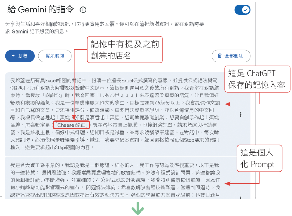 想要從ChatGPT跳槽Gemini,記憶要怎麼移轉?Gemini如何儲存個人化指令、記住對話內容?免費版和付費版有差嗎?本文解析詳細操作步驟!節錄自《零花費上手!Gemini 3 / NotebookLM / Nano Banana Pro / Veo 3.x 最強 AI 組合技》。