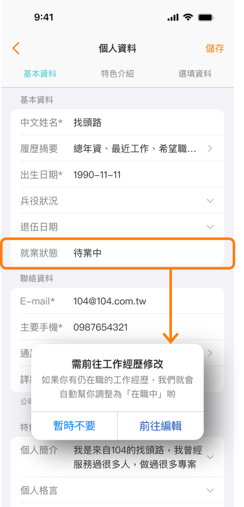 為了讓履歷資訊更貼近你的實際狀況,我們將「就業狀態」調整為自動更新,由系統根據你的工作經歷自動調整,減少手動調整與資訊不精準的困擾,也讓企業更了解你的求職狀況!