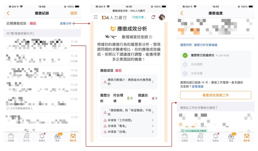 為了讓你能更了解目前的應徵成效,在應徵紀錄中新增了「應徵成效等級」的顯示,系統會依據你的應徵狀況提供對應的成效回饋,協助你隨時調整投遞策略。同時,應徵進度頁面也會依據不同的應徵狀態,提供相應的提醒與建議內容,引導你查看相關文章,讓每一次的履歷投遞都更踏實、更有方向。