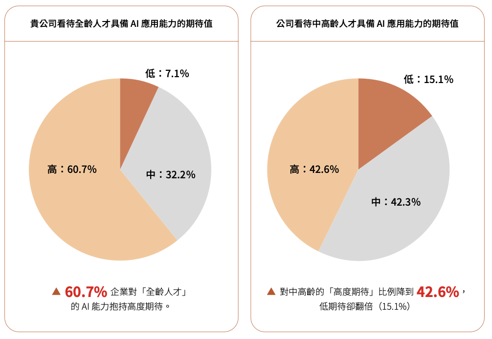 當企業一方面期待「全齡人才」具備高度 AI 應用能力,另一方面卻在中高齡族群身上降低標準,問題其實不在年齡,而在制度與資源是否給對。104 高年級調查清楚揭示這個矛盾:企業對整體人才的 AI 能力期待高達六成,但對中高齡的高期待卻明顯下滑。這樣的落差,不是能力不足的證據,而是訓練機會與學習支持不對等的結果。當 AI 被錯誤地貼上「世代標籤」,企業真正流失的,其實是可立即轉化為生產力的經驗與穩定戰力。
