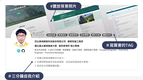 ● 放個人照片:加上個人特質的tag,加深面試官對你的第一印象。