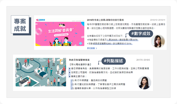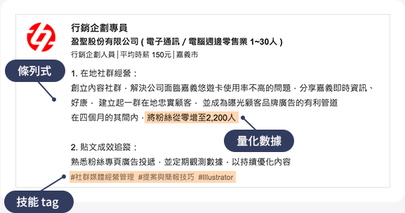 ● 量化工作戰果:盡量將工作戰果量化,如效益提升xx%,並利用工作技能tag標註,強化技能專長。
