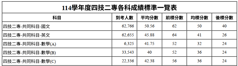 針對全體考生,114統測共同科目成績標準如下:
