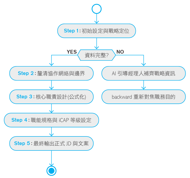 ●AI檢核點:AI需自行檢查生成的職責是否具備「可稽核性」,並為每一條職責建議對應的「產出文件」與「KPI 指標」。Step 4: 職能規格與任用標準