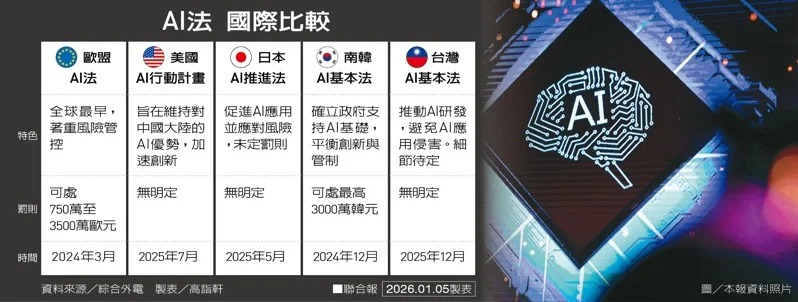 立法院去年底通過AI基本法前,美、歐、日、韓都已相繼制訂AI專法或政策計畫,目標不外乎推進AI研發並明定應如何管制風險。其中,美國著重競逐技術主導地位,與日本同樣仰賴既有法規框架,未新設罰則,這一點似乎與我國類似。歐盟則強調管理風險,與南韓均能處罰企業。