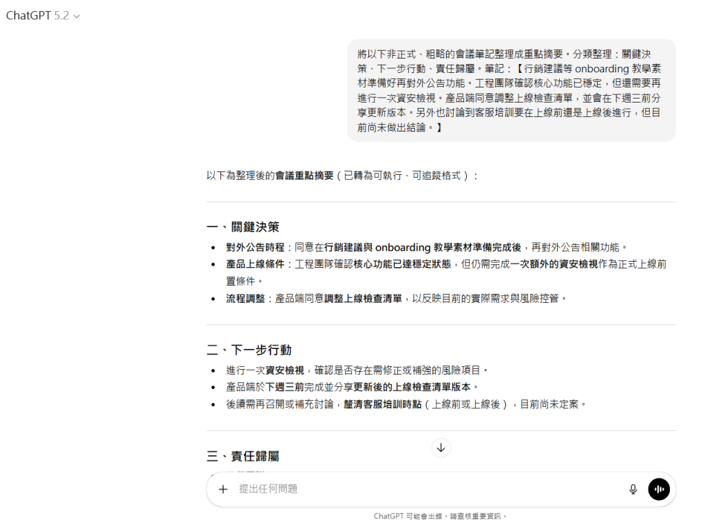| 總結會議記錄 | Summarize these meeting notes into a structured recap. The notes are rough and informal. Organize them into categories: key decisions, next steps, and responsibilities. Notes: [paste text]. (到ChatGPT試試!) | 將以下非正式、粗略的會議筆記整理成重點摘要。分類整理:關鍵決策、下一步行動、責任歸屬。筆記:【貼上原始內容】 (到ChatGPT試試!) |