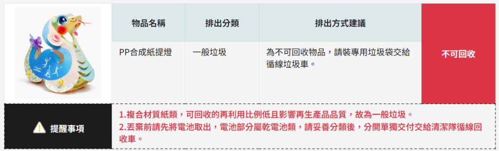 - 小提燈:不可回收,為一般垃圾,丟棄前請將電池取出。電池屬於乾電池須回收。