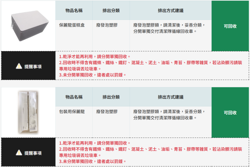 - 保麗龍:保麗龍可回收。屬於廢發泡塑膠類,例如保麗龍蛋糕盒、包裝用保麗龍,請清潔後妥善分類,分開單獨交付清潔隊循線回收車。