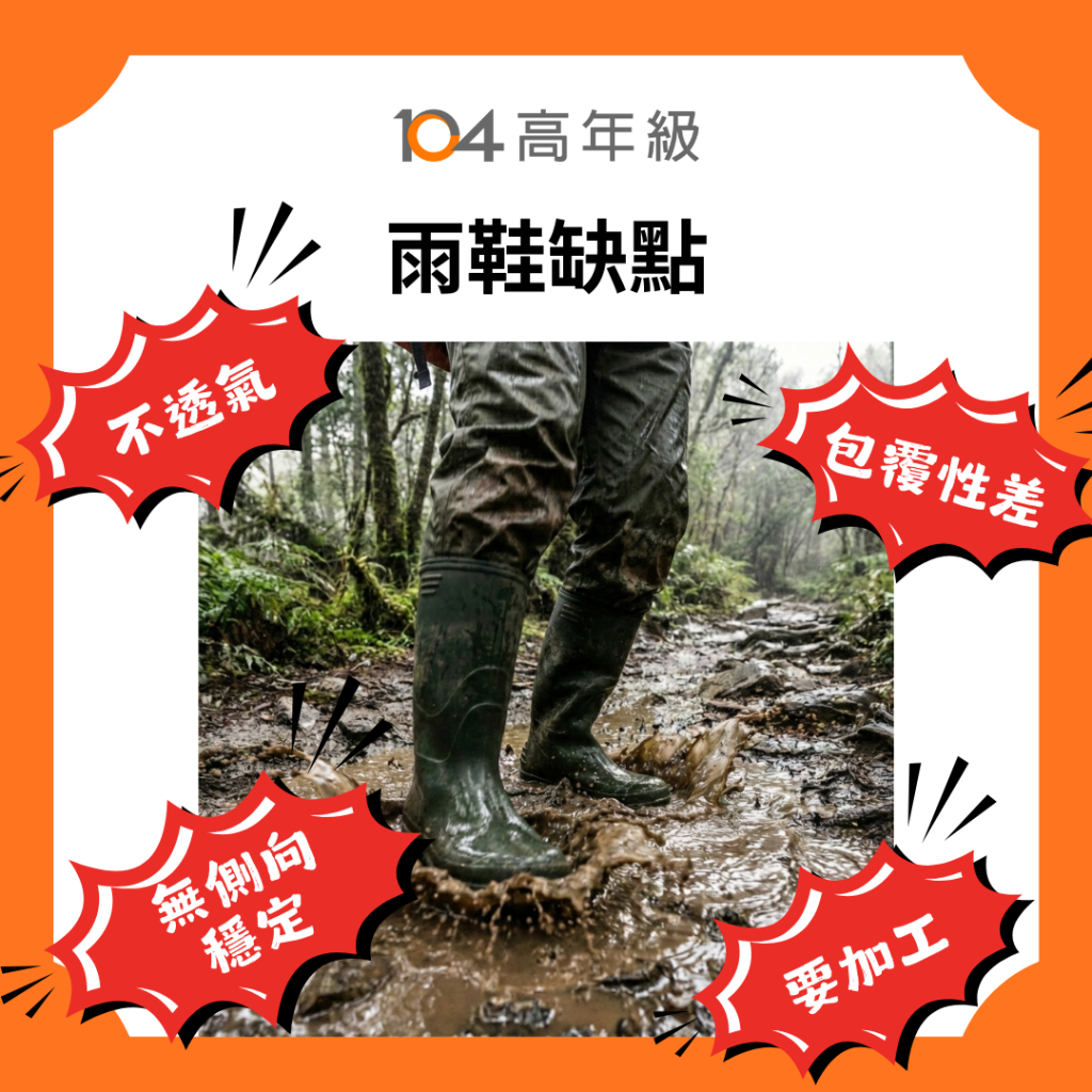雨鞋結構簡單,無側向穩定的加強,若路況崎嶇、背重裝登山…等,穿雨鞋登山的扭傷風險就會提升喔。