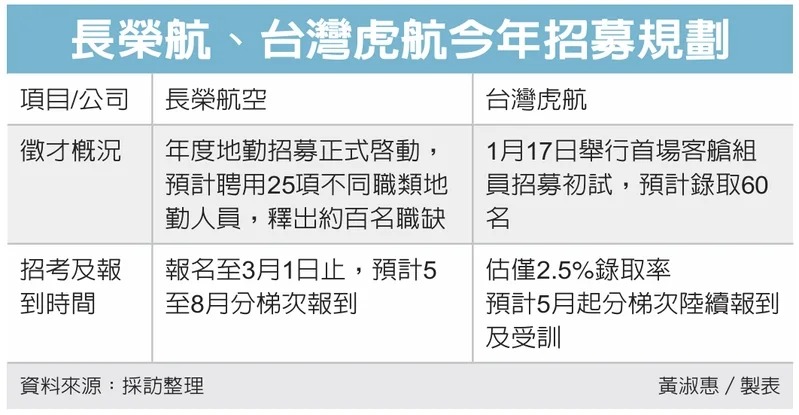 | 徵才概況 | 年度地勤招募正式啟動,預計聘用25項不同職類地勤人員,釋出約百名職缺。 | 1月17日舉行首場客艙組員招募初試,預計錄取60名。 |
