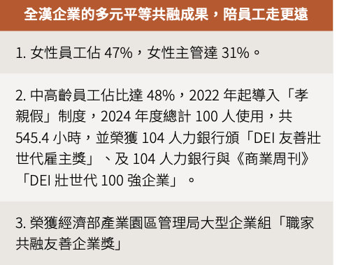 她強調,退休回聘不只是延長勞動力,更是尊重資深價值。「我們相信,年齡不是退場的理由,而是經驗累積的起點。」全漢更將高齡留任與回聘比例納入KPI,每年追蹤,確保制度落實。正如趙女士所說:「我不覺得自己是『被包容』的人,我是被需要的人。」這正是全漢友善職場的最動人註解。