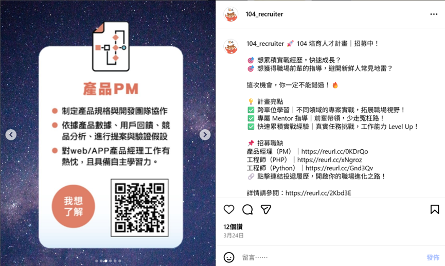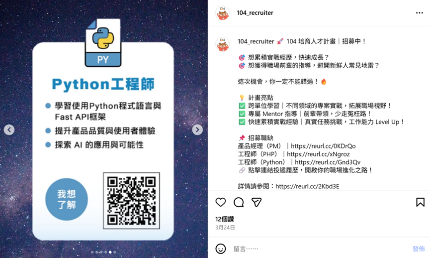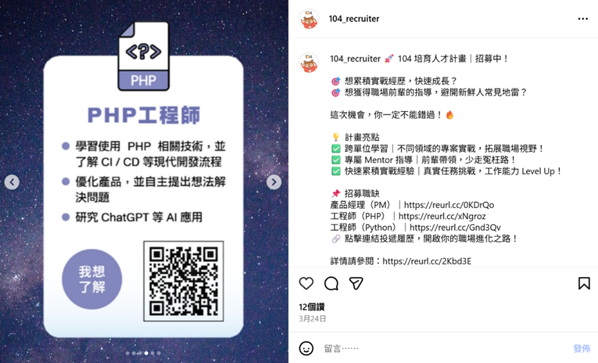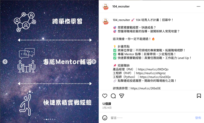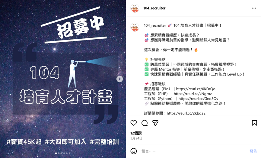 除了亮點視覺與職缺卡片,另一個效果極佳的內容形式,是 真實員工出鏡的代言圖或故事貼文。