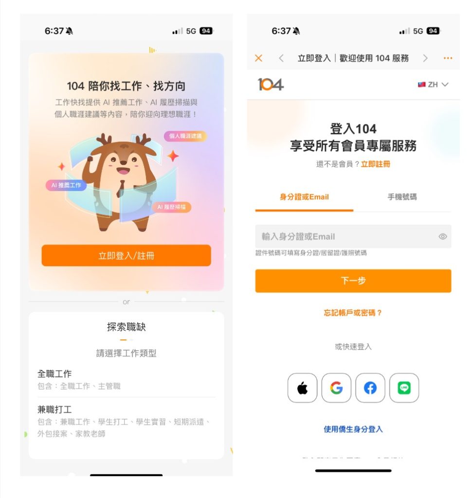 因應越來越多 AI 功能陸續上線,我們優化了登入體驗,讓你在首次開啟 App 時,能一眼掌握現有的 AI 功能並快速進入登入、註冊頁面,讓整體流程更順暢,幫助你更快展開專屬的求職旅程。