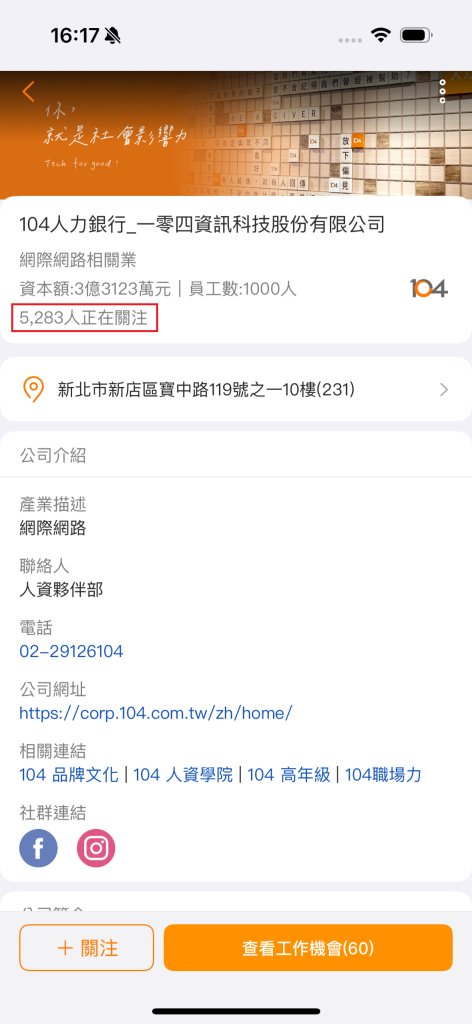 這次更版我們在公司說明頁加上了關注數,提供更全面的求職資訊,當你點擊 [+關注] 時,不僅能將公司加入關注名單,還能為公司的人氣實力加分,一眼看出企業吸引力!