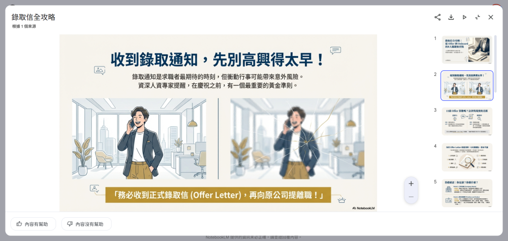 我們以職場力文章「收到錄取信要注意什麼?口頭Offer有效嗎?人資提醒:正式錄取通知有8大檢查點」為例,讓NotebookLM生成簡報。觀察生成的簡報內容,不論是內文或配圖解說,都是基於使用者所上傳的資料,內容架構清晰,版面設計乾淨專業。