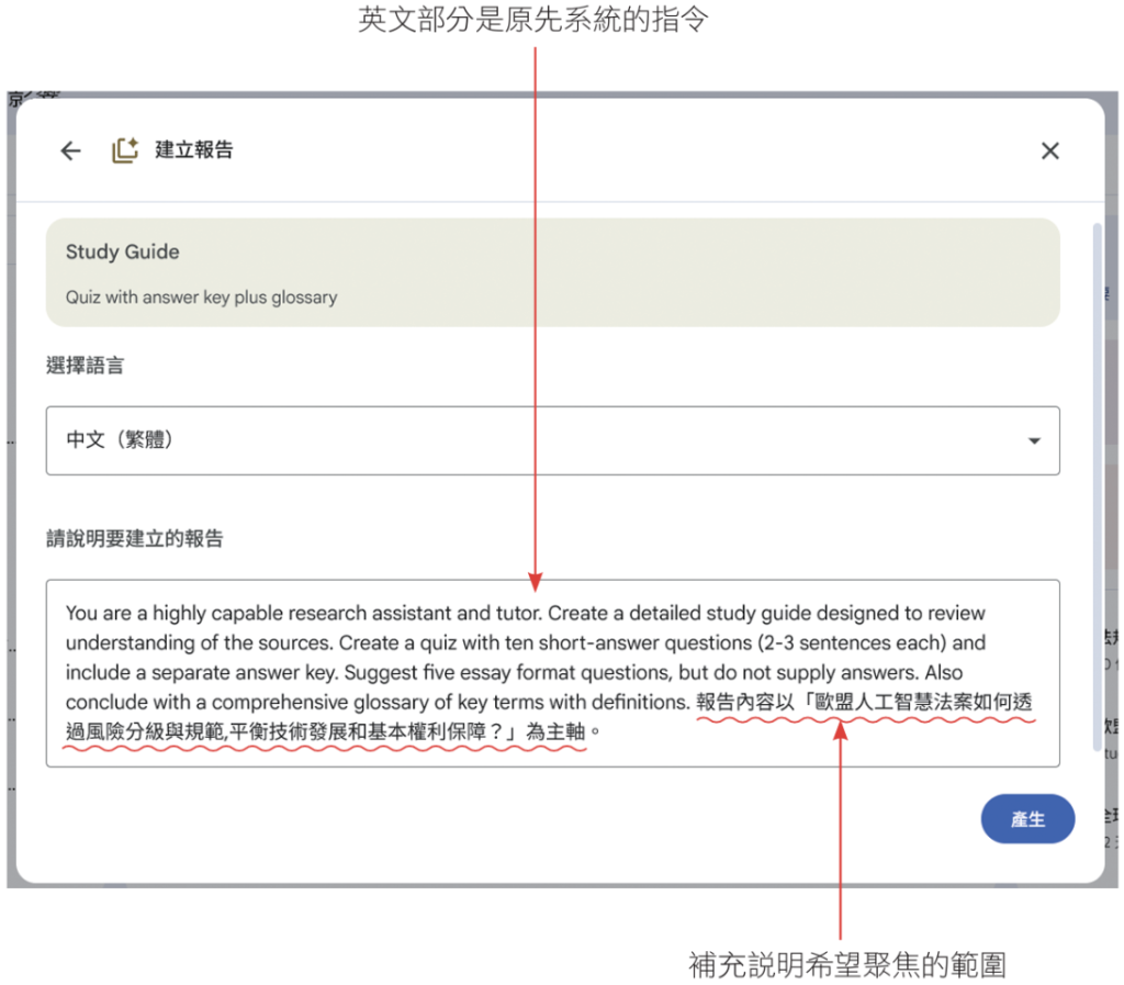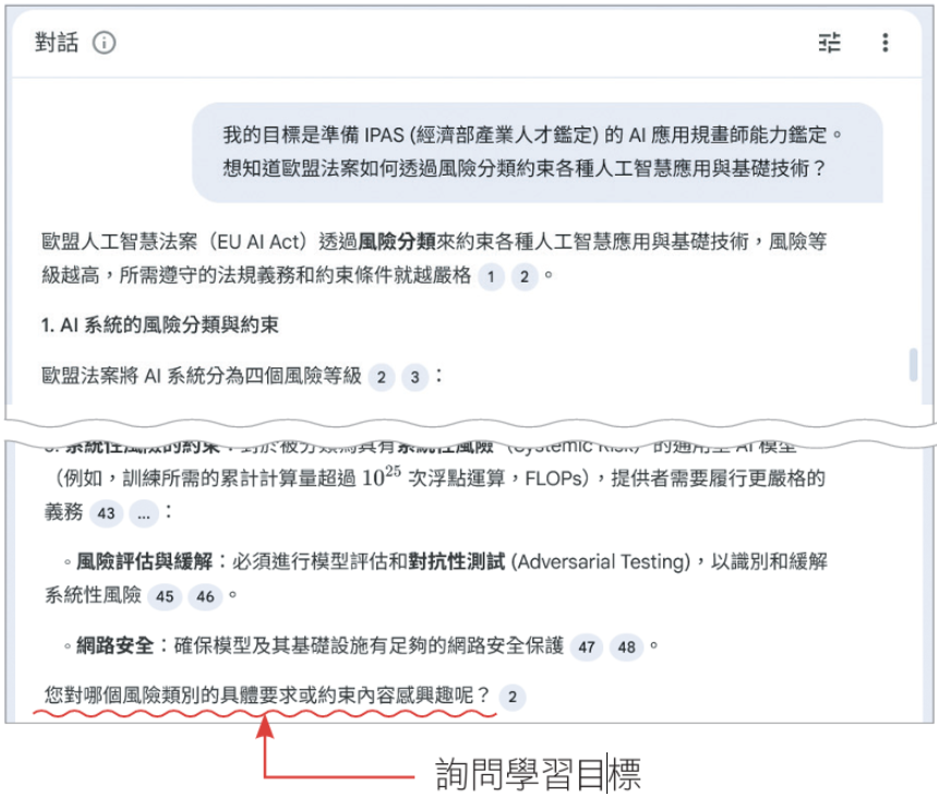 為了縮小備考的範圍,更容易聚焦學習,可以選擇心智圖的某一標籤,或是對話提示的特定學習目標(本案例的步驟2為歐盟人工智慧法案如何透過風險分級與規範),來自訂指令,讓學習指南的內容不會太發散。我們會保留原先系統的指令,並把希望它聚焦範圍的指令補充上去。